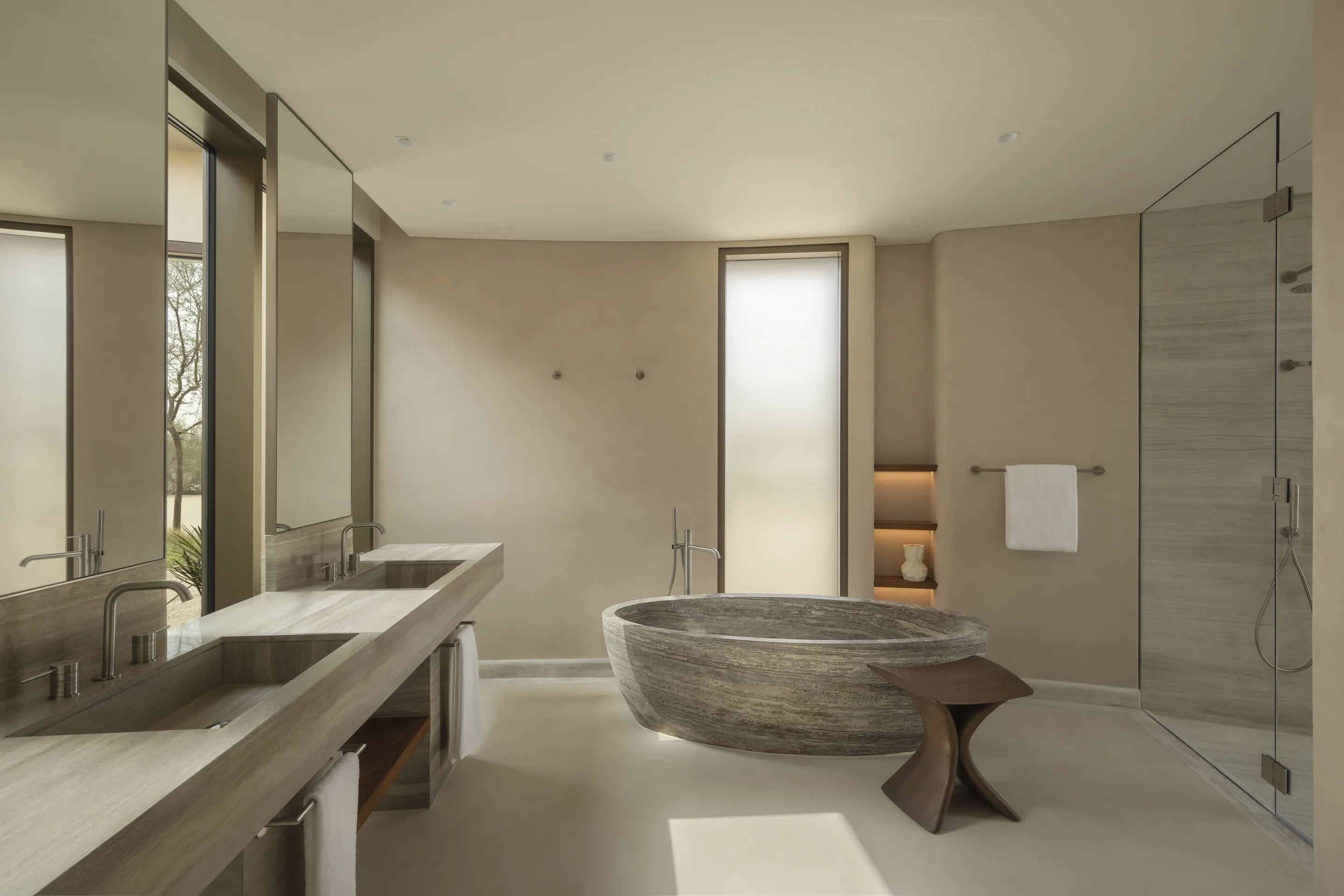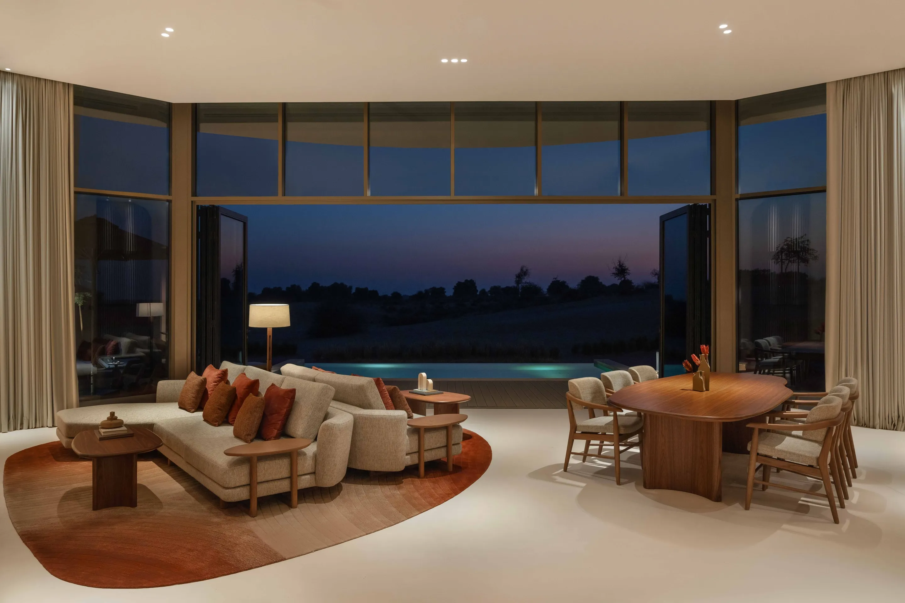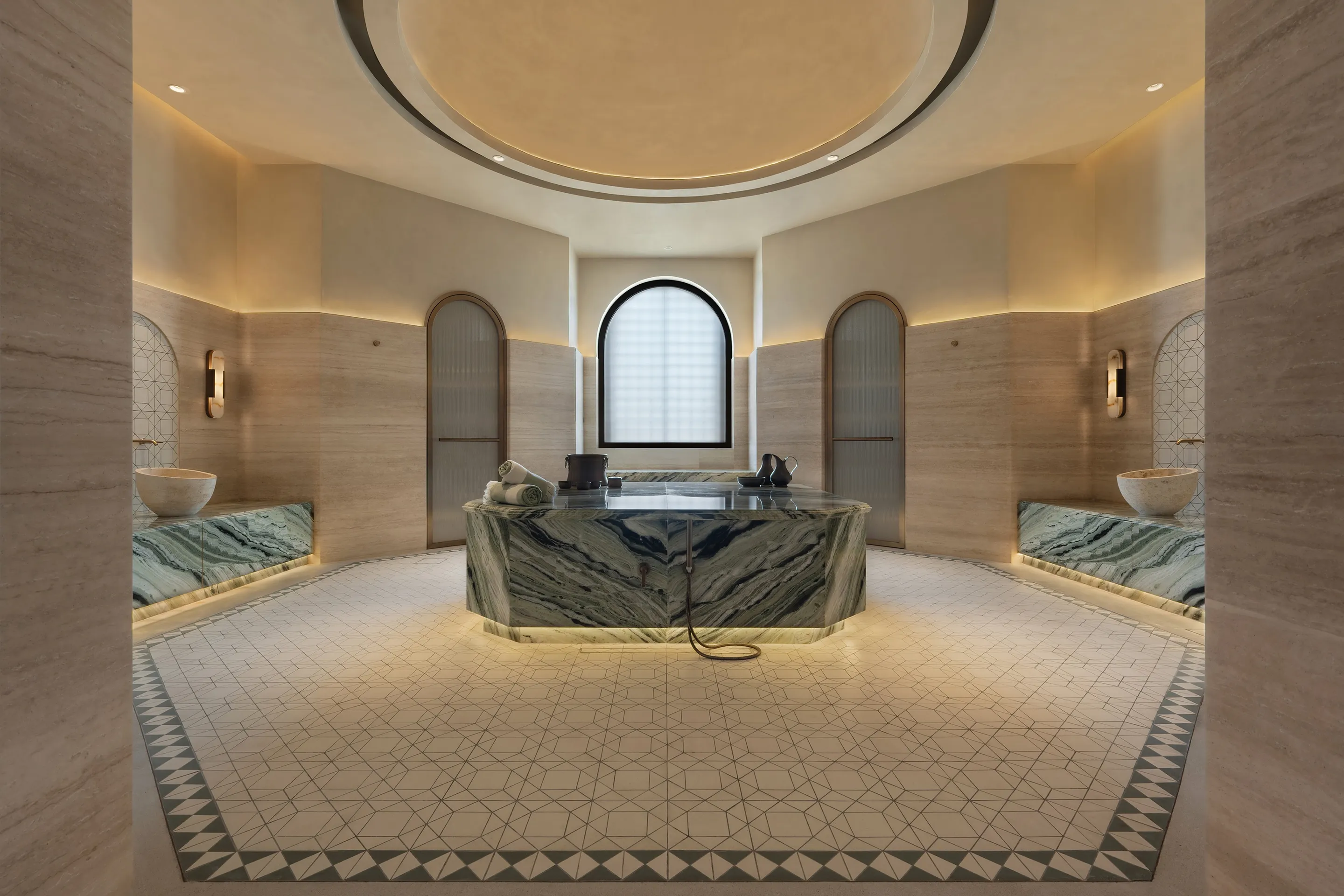 Inside, interiors lean deeply into regional textures without falling into themed costume. Smooth plaster walls, timber ceilings, patterned floors and impossibly heavy doors create a setting that feels handcrafted rather than manufactured. The entire effect is luxurious, yes, but more like an heirloom bracelet than a fresh-off-the-rack designer logo.