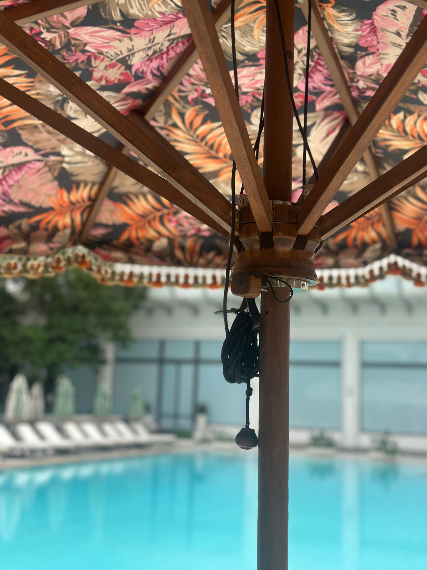 Back inside, the pools are their own stage. The main pool is dazzling, framed by striped umbrellas whose undersides are patterned like bold wallpaper. Even the shade feels stylish. And then there’s the black pool (reserved for the penthouse) —smaller, quieter, perched next to dramatic mountain views. It’s so peaceful you find yourself whispering without realizing it.