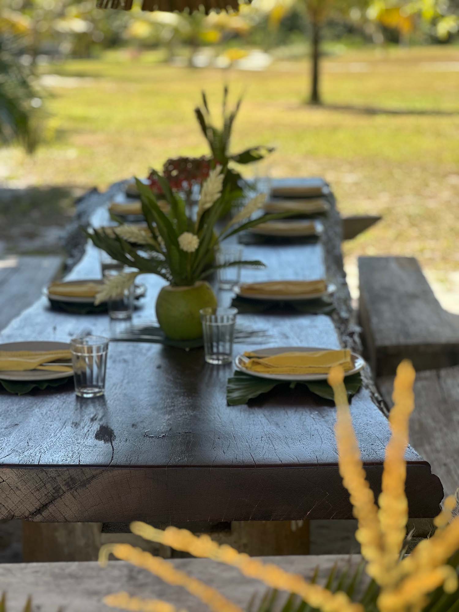Dining continues this philosophy of rooted simplicity. The chef creates daily menus shaped by what the fishermen bring from the sea and what ripens in the gardens. When we visited, we tasted one of her creations: grilled fish, impossibly fresh vegetables, and a dessert of homemade mango and yogurt ice cream, served over crisp dried coconut. Elegant, unfussy, and unforgettable.