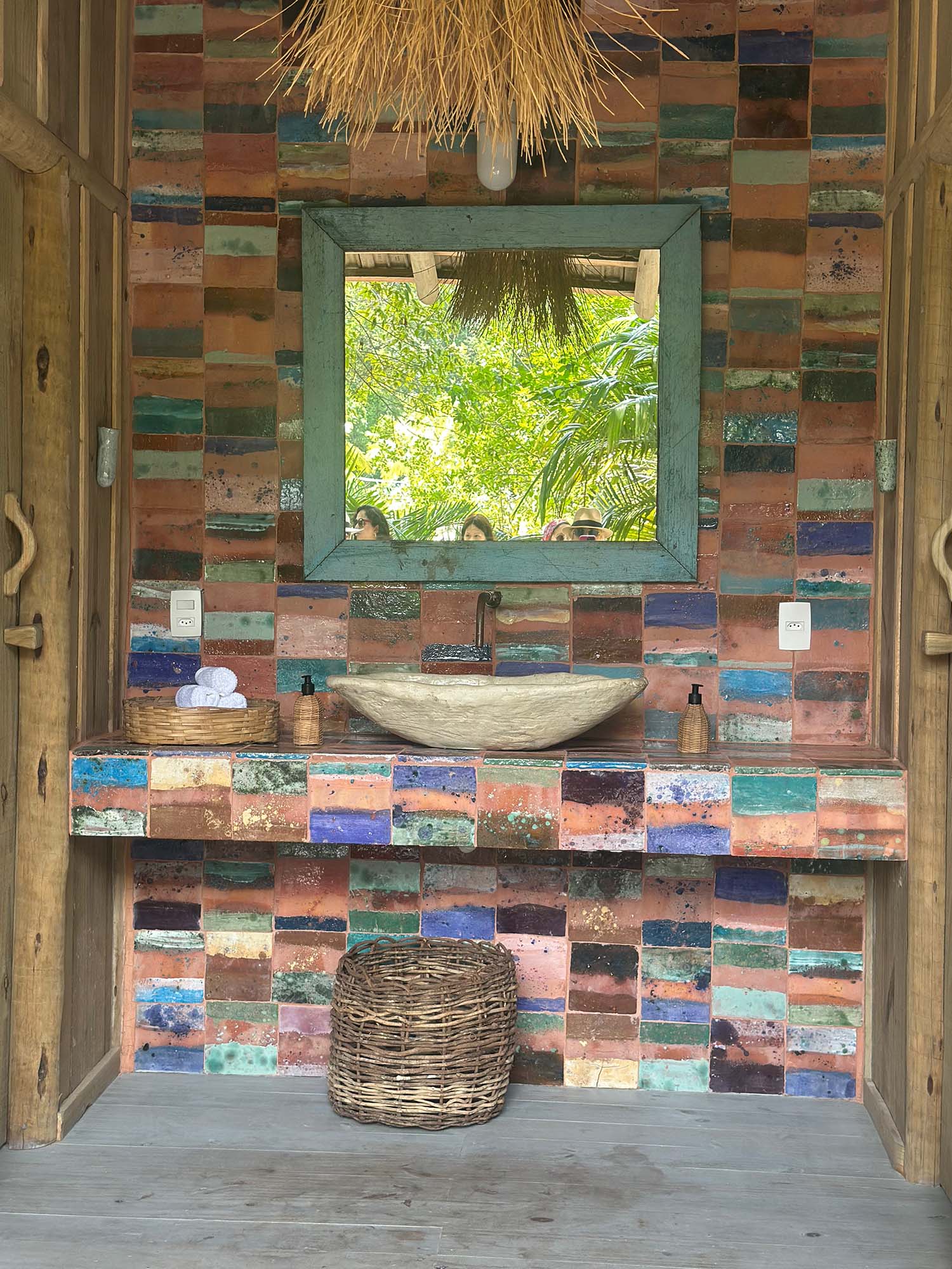 Step inside and the details tell the story. Original wooden beams run overhead, bearing the marks of age and time. Handcrafted tiles, each unique, line the floors and walls, cool underfoot and alive with character. Nothing feels new for the sake of new—everything has been touched by hand, preserved, or made with intention. The architecture is not just restored; it is reimagined, blending the soul of Bahia’s past with a quiet, contemporary elegance.