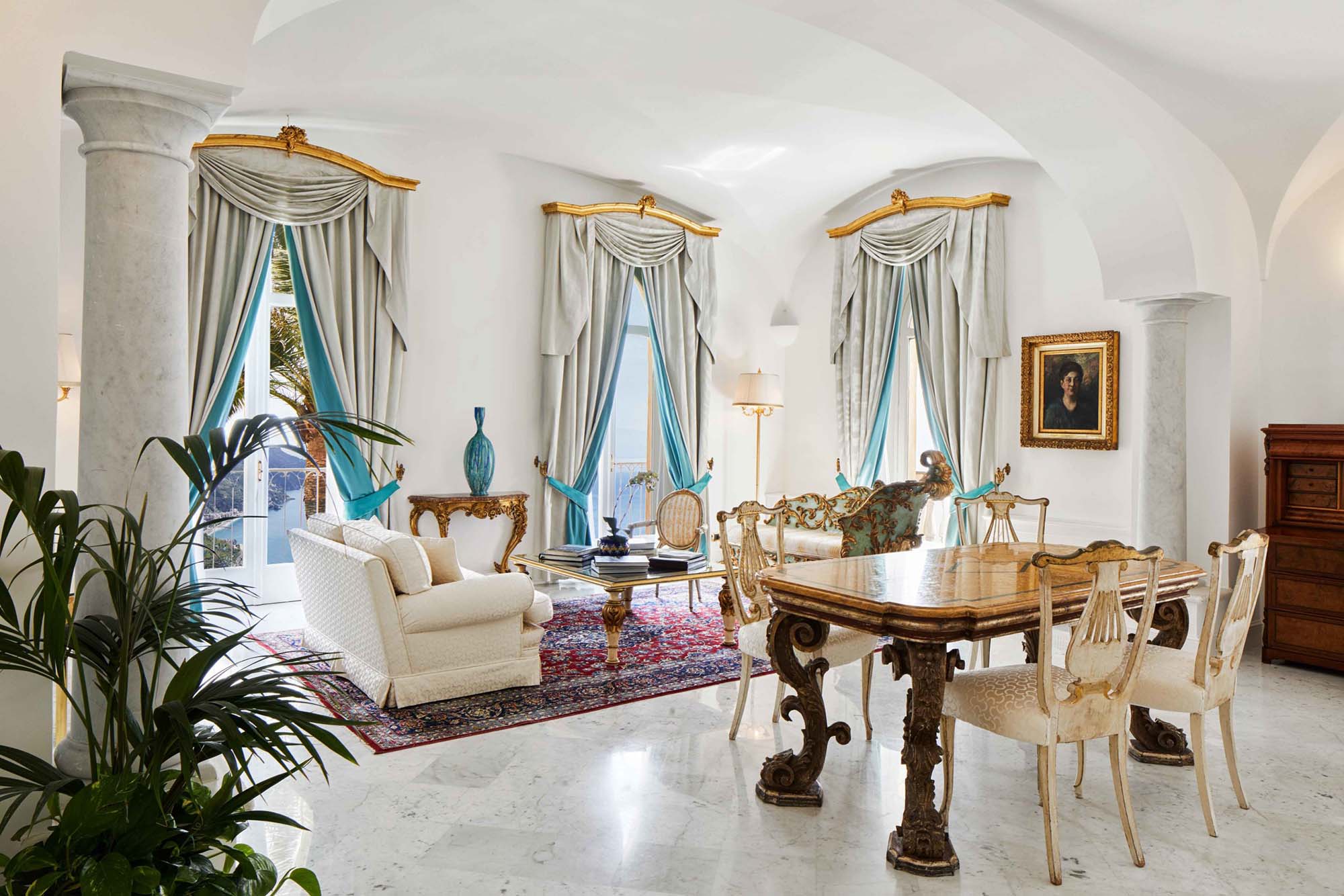 The suites of Palazzo Avino mix the historic and regal with the modern and neutral. Marble floors ground the palatial spaces, covered with intricately designed antique rugs and furnished with a mix of antiques and modern pieces. Completed with intricate brocades and tapestries, the decor is staged to make one feel like they are in the lap of luxury, only to look out the floor-to-ceiling windows onto the sea to be grounded. It’s a pleasurably fashionable mix of extravagance and experience.