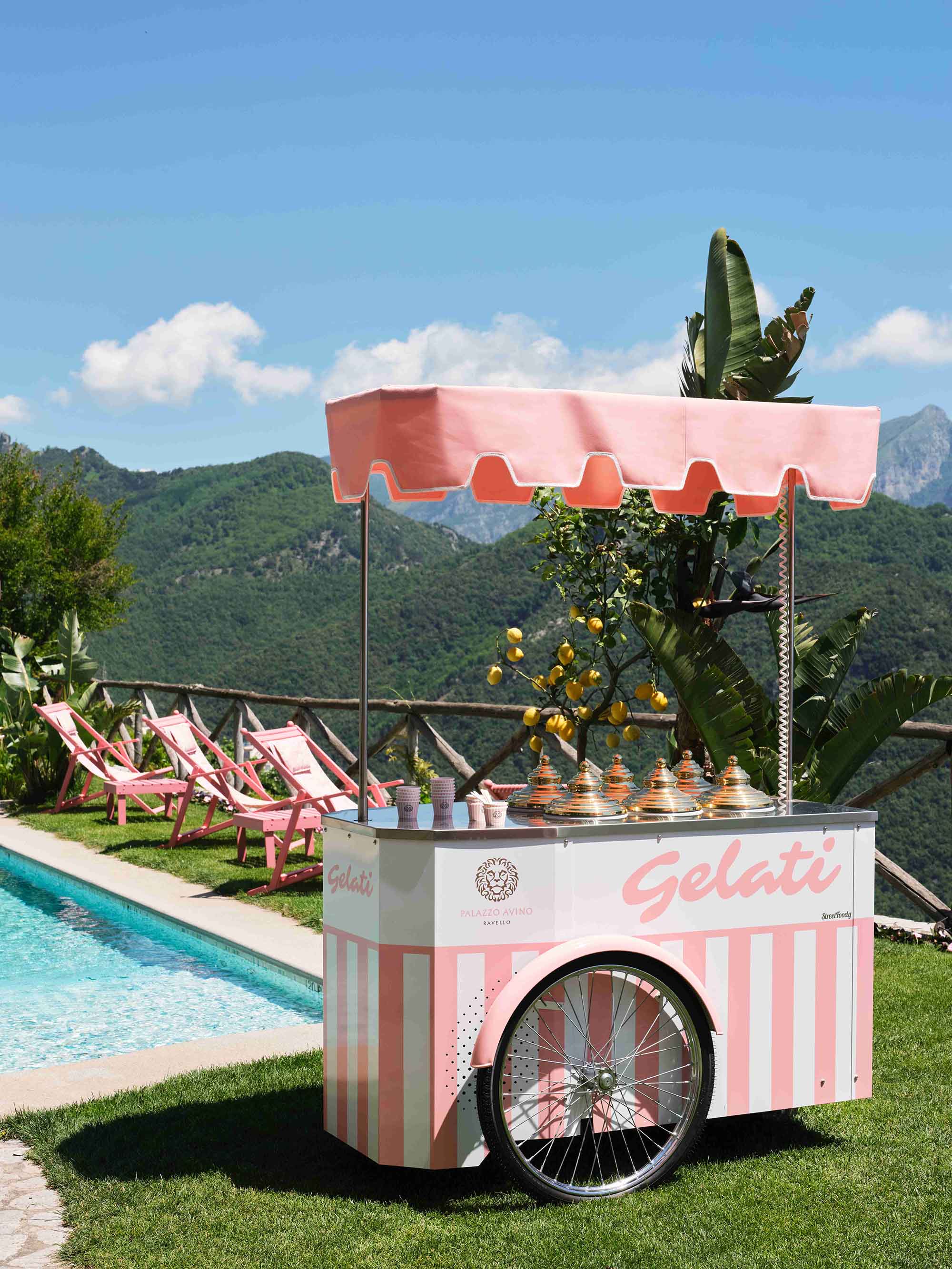 When we aren’t headed to the beach club (more on that soon), we’ll be lazing at the picture-perfect heated swimming pool in the gardens. You’ll find pink chairs and loungers, complete with pink umbrellas, dotted on the grass around the pool. Be on the lookout for the gelato cart that’s also (we’re sensing a theme) pink.