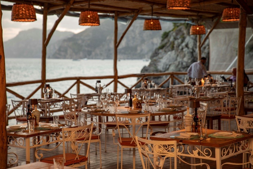 Al Mare, the hotel's beachside restaurant perched on a stone terrace just steps from the beach club, offers a more casual dining option. The food is traditionally based in seafood and handmade pizzas cooked on the wood fired pizza oven. Nearby Il Grottino Bar, carved into the rock, is lit at night by tea lights overhead, creating a beautiful and breathtaking scene for a sunset cocktail. A bit higher up is the Bar La Terrazza, another all-day eatery with bistro-style food and a perfect spot for pre- or post-dinner drinks later in the evening.