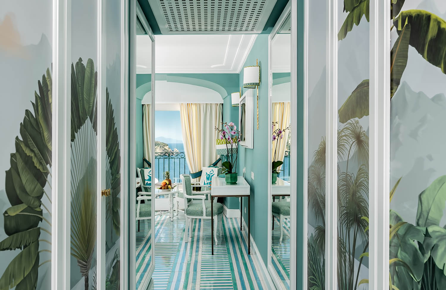 The hotel's design seamlessly blends with the natural surroundings, featuring terraces carved into the cliffs, verdant gardens, and a stunning infinity pool that seems to merge with the sea. The elegant yet understated décor reflects the beauty of the Amalfi Coast, with natural materials and a color palette inspired by the Mediterranean.